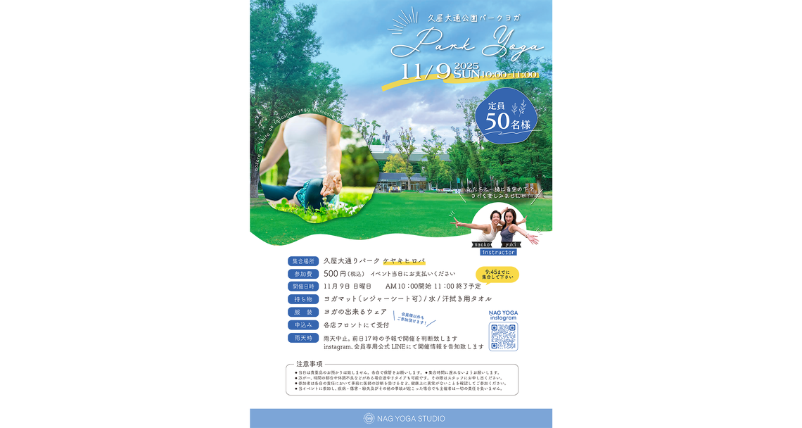 ※雨天中止、前日17時の予報で開催を判断します。ナグヨガスタジオのインスタグラムにて開催情報を告知します。