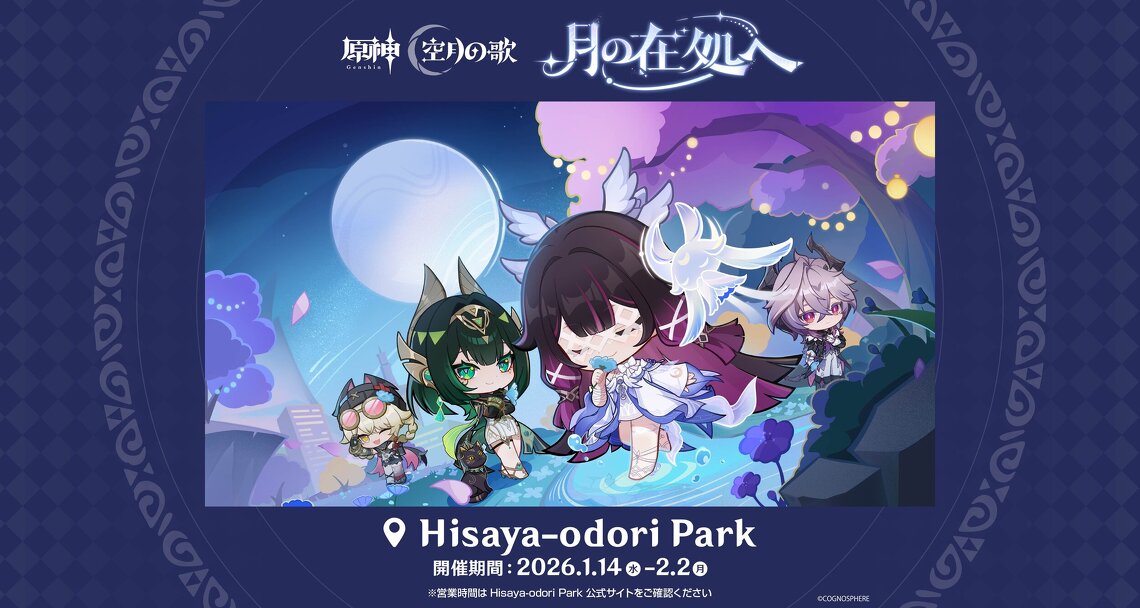 グローバルに展開するインタラクティブエンターテインメントブランドのHoYoverseは、マルチプラットフォーム対応オープンワールドRPG『原神(げんしん)』において、2026年1月14日(水)に予定している「LunaⅣ」のリリースを記念し、同日1月14日(水)より、Hisaya-odori Parkにて『原神』「LunaⅣ」リリース記念オフラインイベント「月の在処へ」を開催することをお知らせいたします。本イベントでは、期間中、本イベント限定のスペシャル展示を実施します。また、あわせて、描きおろしイラストを使用した限定グッズの販売、オリジナルコースター付きのイベント限定フードやドリンクの提供、オリジナルレンチキュラーカードがもらえるスタンプラリーなど、さまざまな施策を実施し、旅人のみなさまをお迎えいたします。