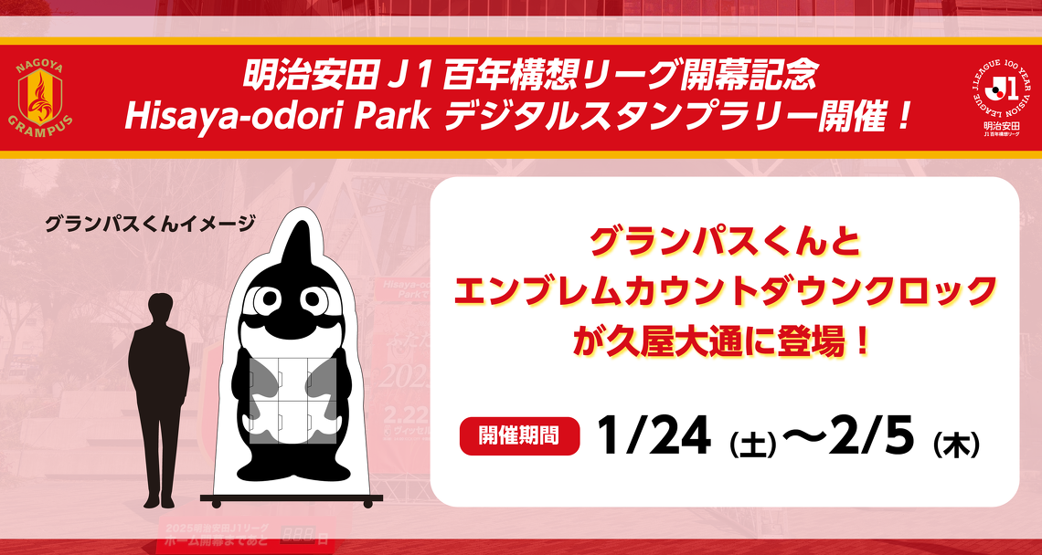 名古屋グランパスは2/8(日)清水エスパルス戦が開幕戦となる「明治安田J1百年構想リーグ」の盛り上げ企画として、Hisaya-odori Parkにてデジタルスタンプラリーを開催します。Hisaya-odori Parkおよびセントラルパークに設置されたエンブレムカウントダウンクロックと3つのグランパスくんモニュメントに掲載された4つのキーワードを集めて名古屋グランパス公式LINEでキャンペーンに参加。抽選で豪華選手サイン入りグッズが当たります。