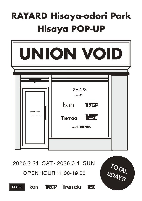 4つのアパレルブランド、セレクトショップが混ざり合い展開するスペース【UNION VOID】を2/21(土)~3/1(日)まで開催いたします。